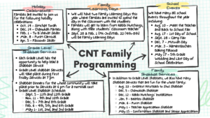 CNT Religious School has programming not only for our students, but for the whole family. We have a variety of opportunities for families to get involved, from Shabbat Dinners and family oriented services, to family learning days, to holiday celebrations, and everything in between. Check out the graphic below to see everything that CNT Religious School has to offer!