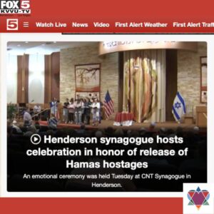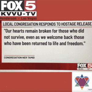 THANKS TO KVVU-TV FOX5 for broadcasting Congregation Ner Tamid Rabbi-Cantor Jessica Hutchings’ statement about the recent release of 20 Israeli hostages from Hamas captivity on its Monday, October 13, evening broadcasts (10:00 p.m. and 11:00 p.m.). CNT’s statement was also broadcast on multiple morning newscasts on Tuesday, October 14.