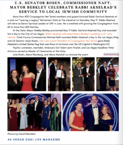 THANKS TO THE LAS VEGAS SUN’S Ray Brewer for his FRONT PAGE article about Rabbi Sanford Akselrad – “Retiring Rabbi Leaves Legacy Of Kindness, Compassion, Inclusivity And Authenticity.” The Monday, June 2, story highlights Rabbi’s 37 years at Congregation Ner Tamid. Plus, there are quotes from Rabbi Cantor Jessica Hutchings, U.S. Sen. Jacky Rosen, Green Valley Presbyterian Church’s Rev. Adrian Doll, and the Interfaith Council of Southern Nevada’s Gard Jameson.