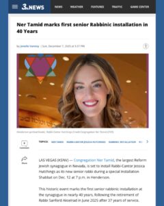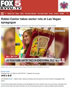 AS CONGREGATION NER TAMID got ready to install a new senior clergy leader on Friday, December 12, 2025, KVVU-TV FOX5’s Evan Leake visited the Temple to talk with Rabbi-Cantor Jessica Hutchings about the honor. His evening news segment was featured on Wednesday, December 10, at 10:00 p.m.