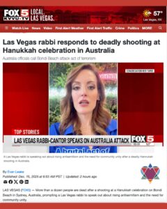 THANKS TO KVVU-TV FOX5’s Evan Leake for featuring Congregation Ner Tamid’s statement about the Chanukah terror attack in Australia as the LEAD story on his station’s Sunday, December 14, 10:00 p.m. broadcast.
