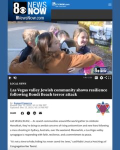 THANKS TO 8 NEWS NOW KLAS-TV (CBS)’s Kamari Esquerra for returning to Congregation Ner Tamid on Monday, December 15, for a second day in a row, to talk with Rabbi-Cantor Jessica Hutchings about security concerns after the Chanukah terror attack in Sydney, Australia. You’ll also hear from Preschool parents Hilary Unger and Jordan Betten, and hear a special “Happy Chanukah” wish in “Las Vegas Valley Jewish Community Shows Resilience Following Bondi Beach Terror Attack.”