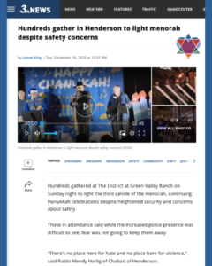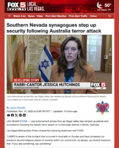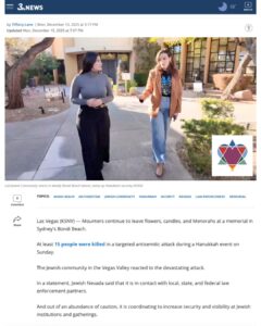 THANKS TO NEWS 3 KSNV-TV (NBC)’s Tiffany Lane for featuring Rabbi-Cantor Jessica Hutchings in “Local Jewish Community Reacts To Deadly Bondi Beach Attack, Ramp Up Hanukkah Security” on Monday, December 15.