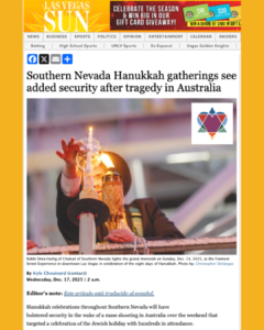 THANKS TO THE LAS VEGAS SUN’s Kyle Chouinard for interviewing Congregation Ner Tamid’s Rabbi-Cantor Jessica Hutchings for his Wednesday, December 17, article, “Southern Nevada Hanukkah Gatherings See Added Security After Tragedy In Australia.”