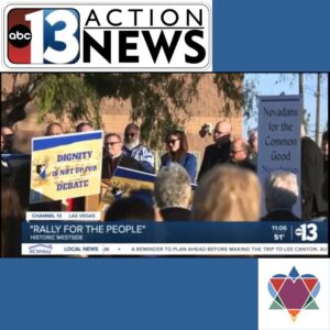 THANKS TO ABC13 KTNV (ABC) for its TV news segment about Nevadans for The Common Good’s “Rally for the People,” at St. James the Apostle Church, on Sunday, December 7. Congregation Ner Tamid’s Rabbi-Cantor Jessica Hutchings participated in the event and can be seen in the news segment HERE.