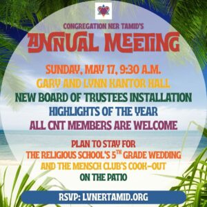 Annual Meeting on Sunday, May 17, in the Gary and Lynn Kantor Social Hall, at 9:30 a.m.